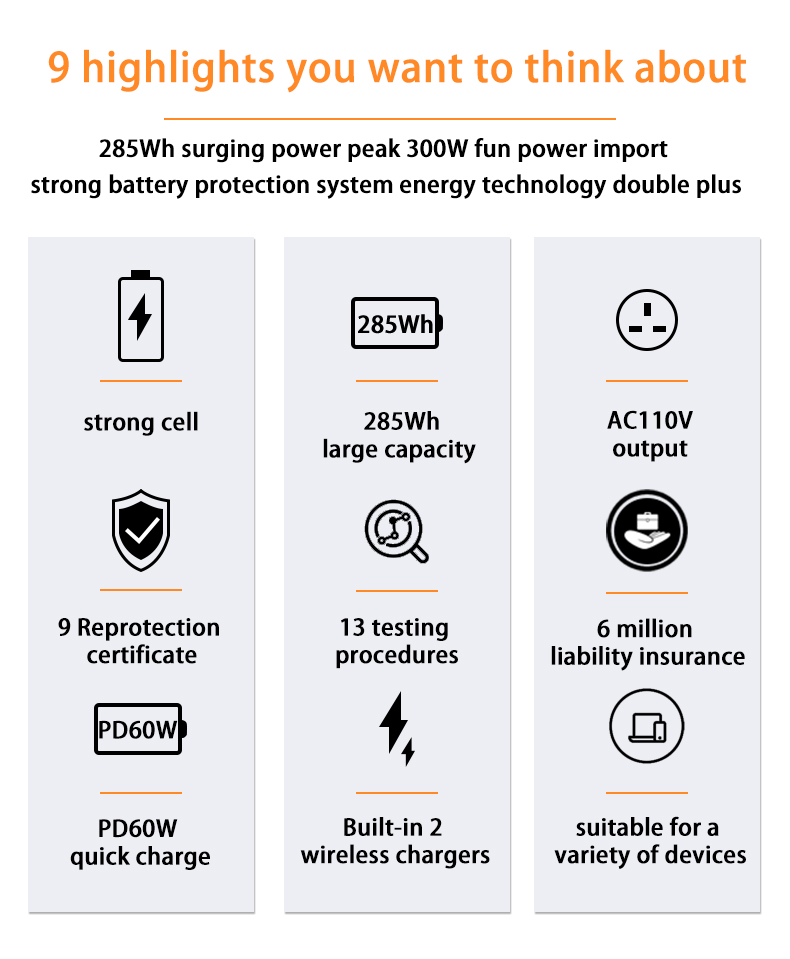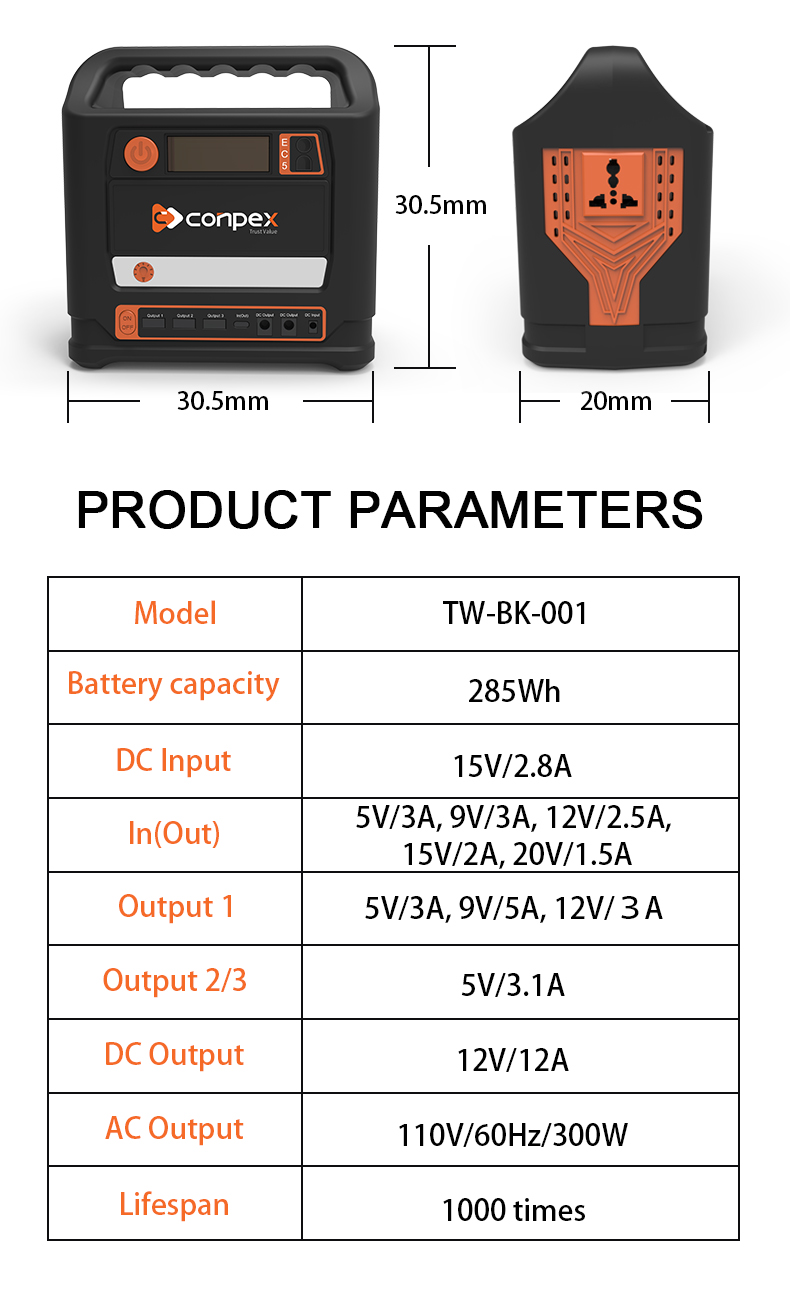 Equipped with a 285Wh battery and 300W power output, the Conpex PowerHub delivers ample energy for multiple devices. With a standard 110V AC output, it ensures compatibility with household electronics, providing a dependable backup power source.