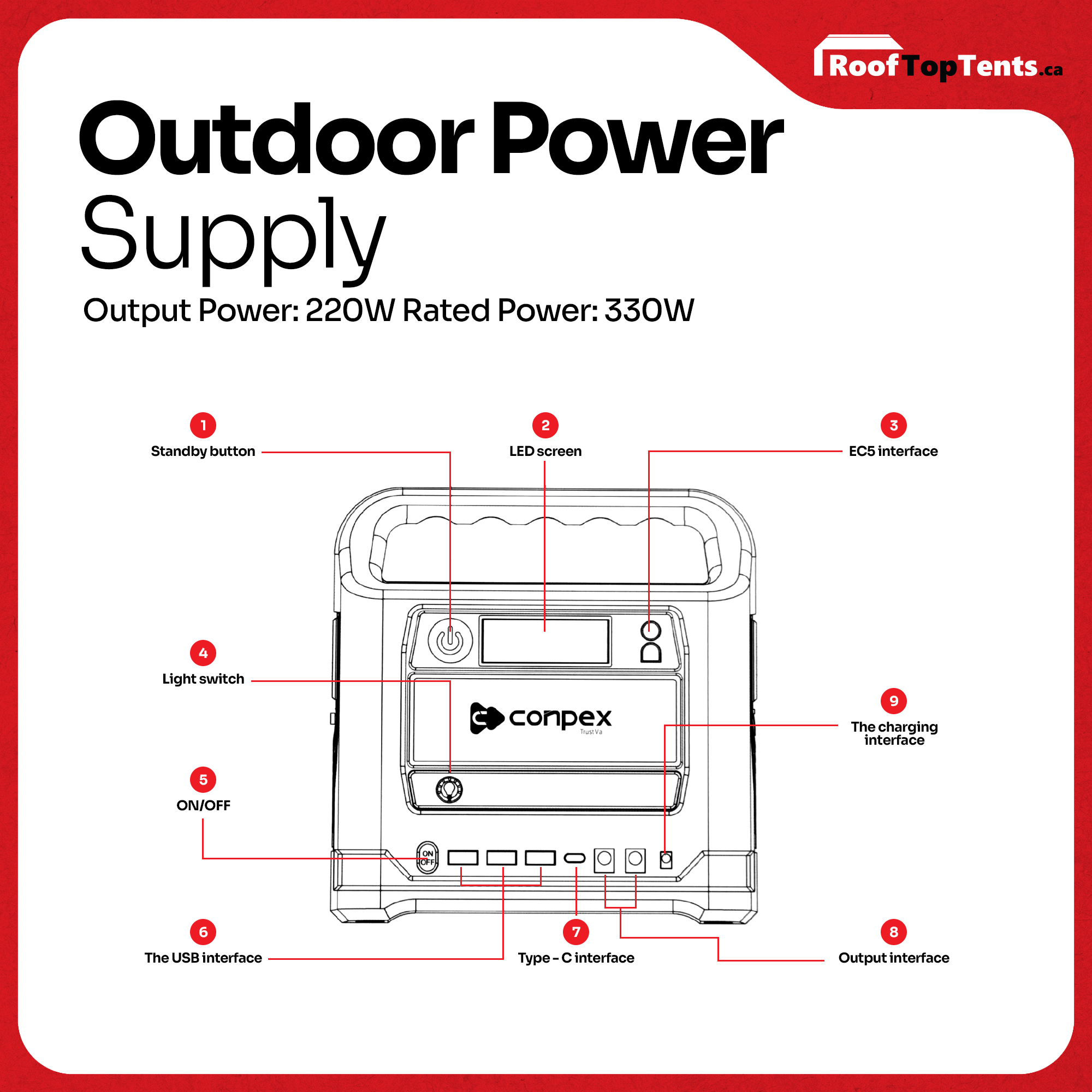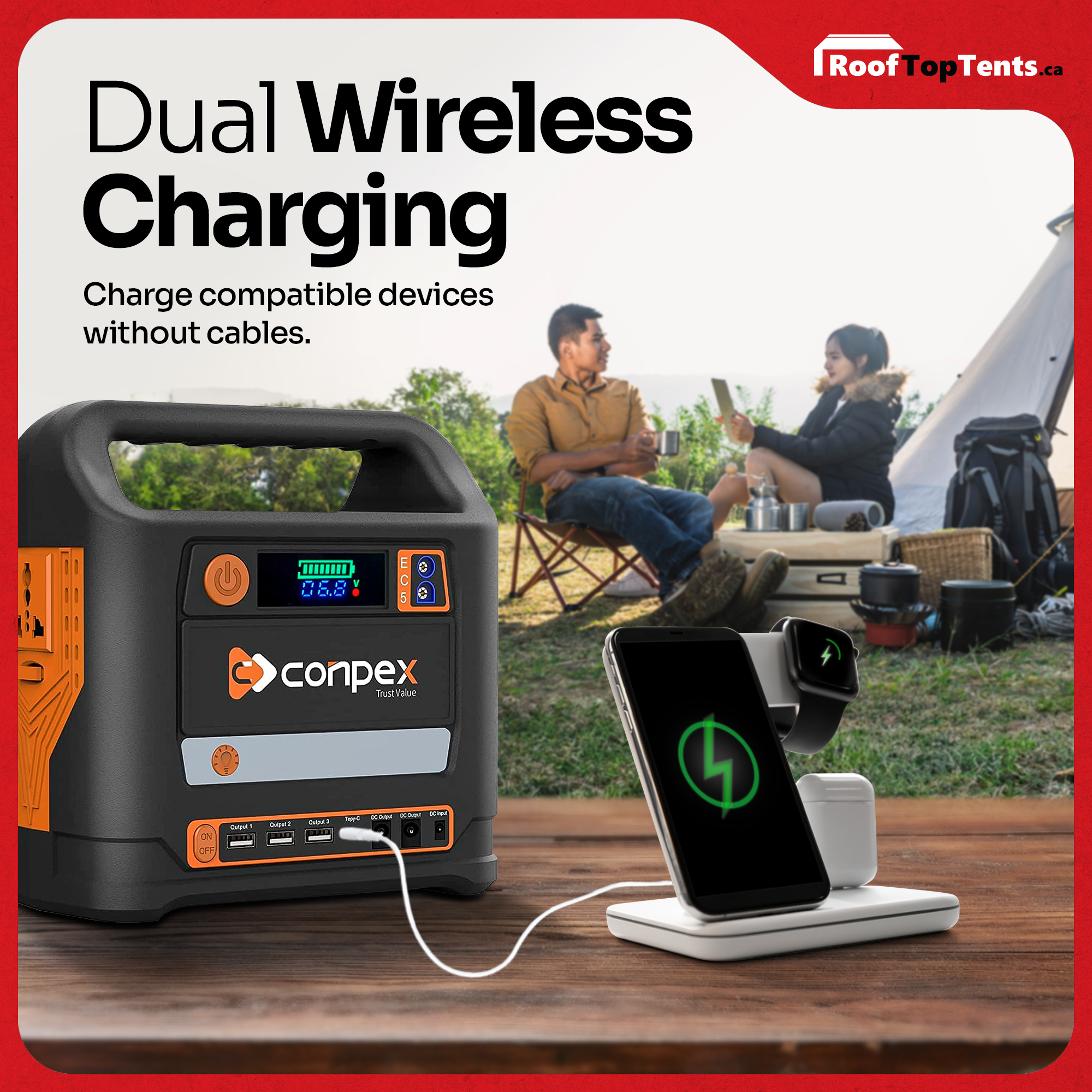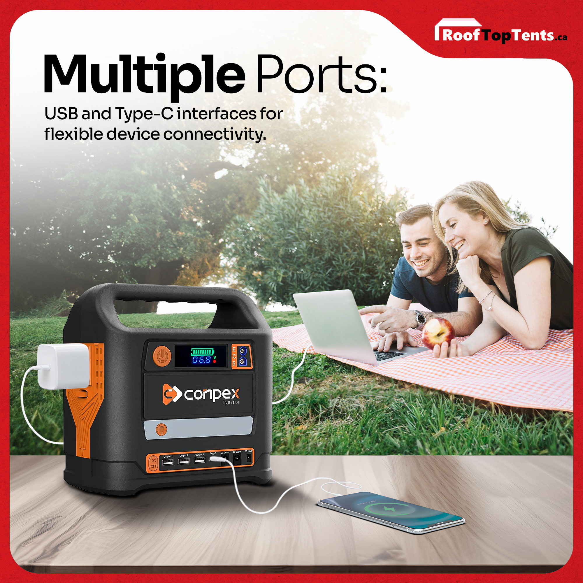 The Conpex PowerHub 300W Portable Power Station is a versatile and efficient outdoor power solution, designed to keep your devices powered during camping, road trips, and emergency situations. Compact, durable, and packed with advanced features, it ensures reliable power wherever your adventures take you.