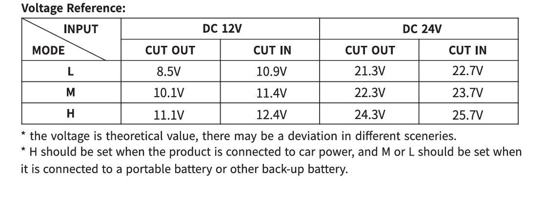 • Battery Protection Mode: Selectable high (H), medium (M), and low (L) settings. The factory setting is H.
