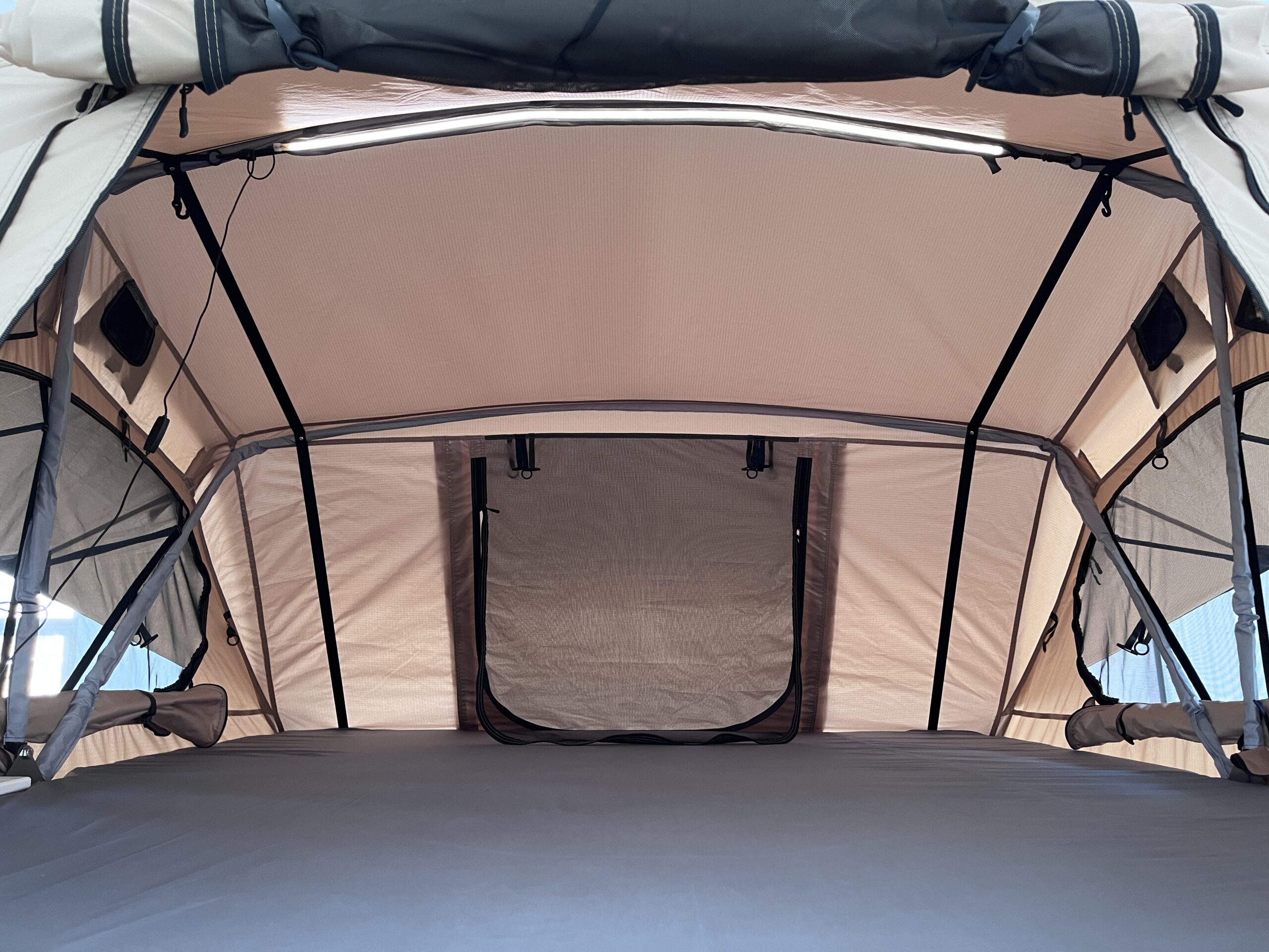 The tent is built on a welded aluminum tube base with insulation and an anti-scratch aluminum sheet on top. This spreads the load across your crossbars and adds a small barrier against cold air flowing under the tent at night. The internal frame uses aluminum anodized curved poles to support the canopy.