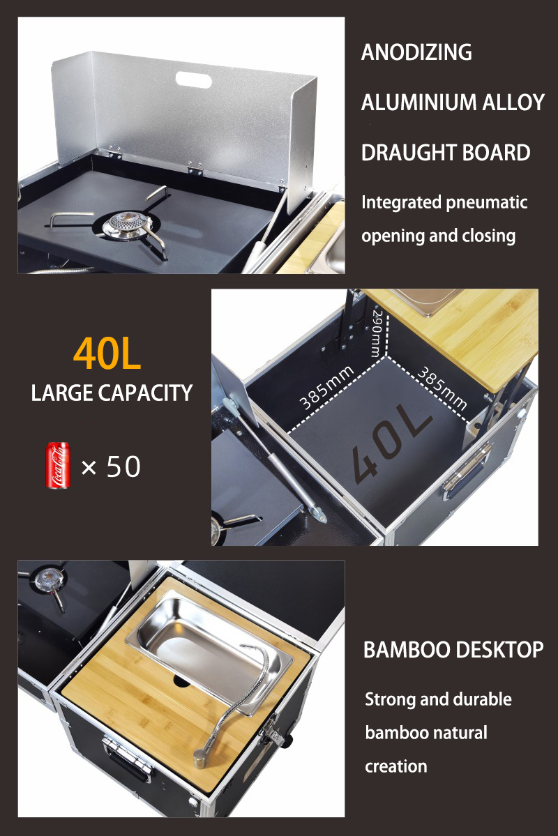 • Complete with Accessories: Includes a water supply system, gas stove, cutting board, and dishwashing sink, making it a versatile camping kitchen with an integrated sink and stove.
