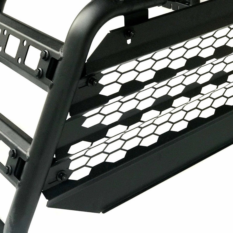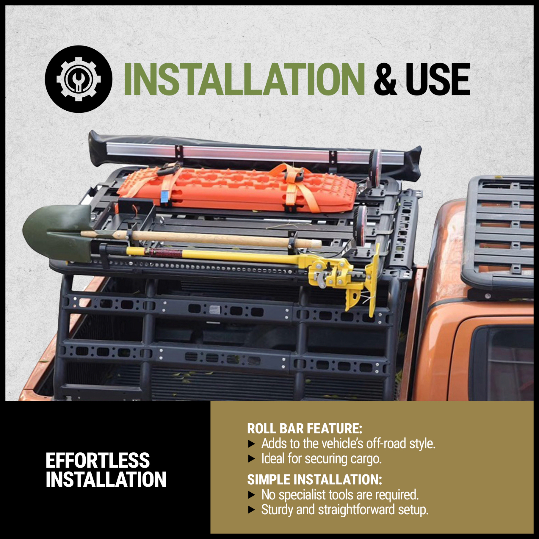 • Roll Bar Integration: The adjustable roll bar enhances the rack’s utility by providing a secure mounting point for cargo stabilization.