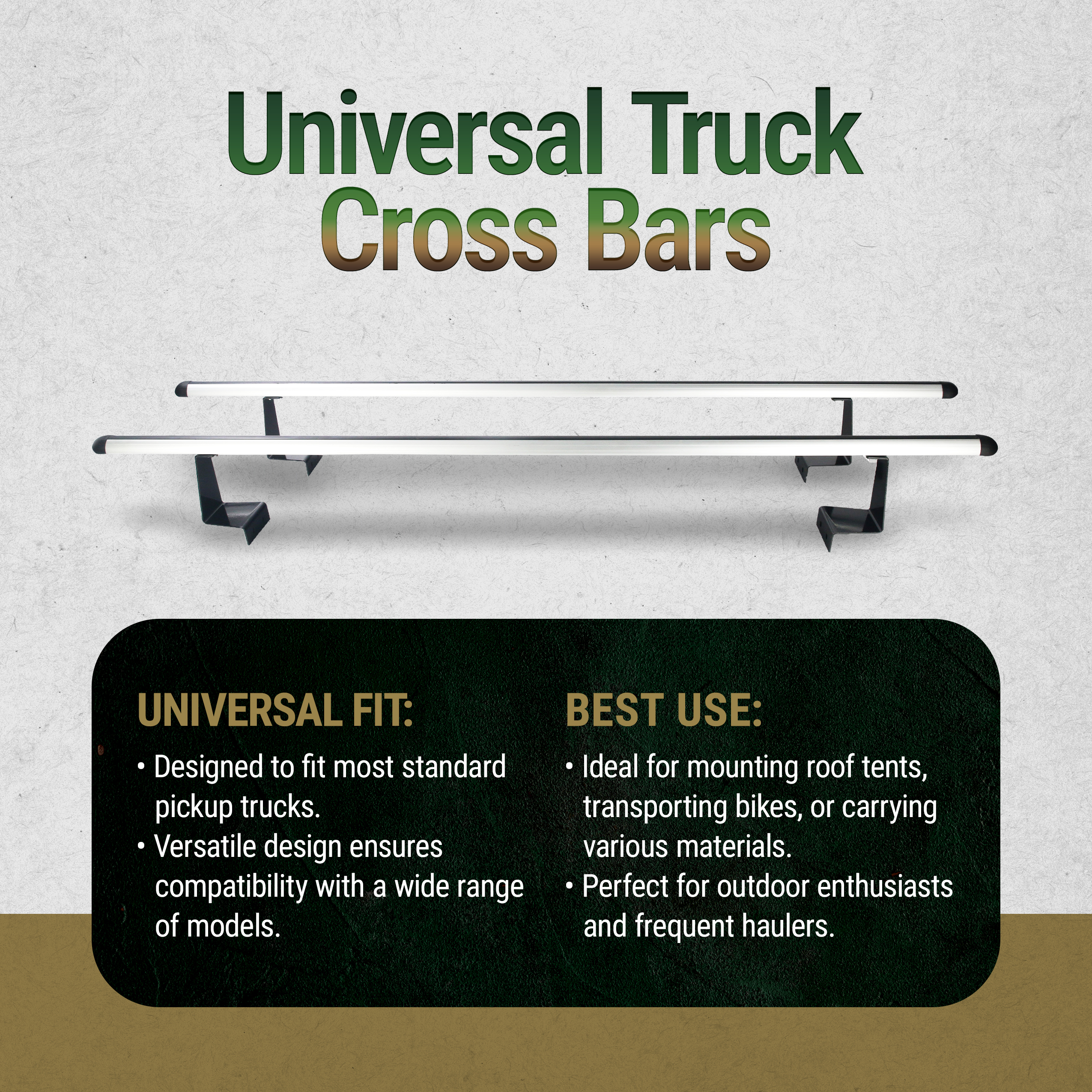The Universal Truck Cross Bars seamlessly fit most standard pickup trucks, providing a reliable solution for transporting gear, tools, and cargo. Designed for broad compatibility, they work across multiple truck models.