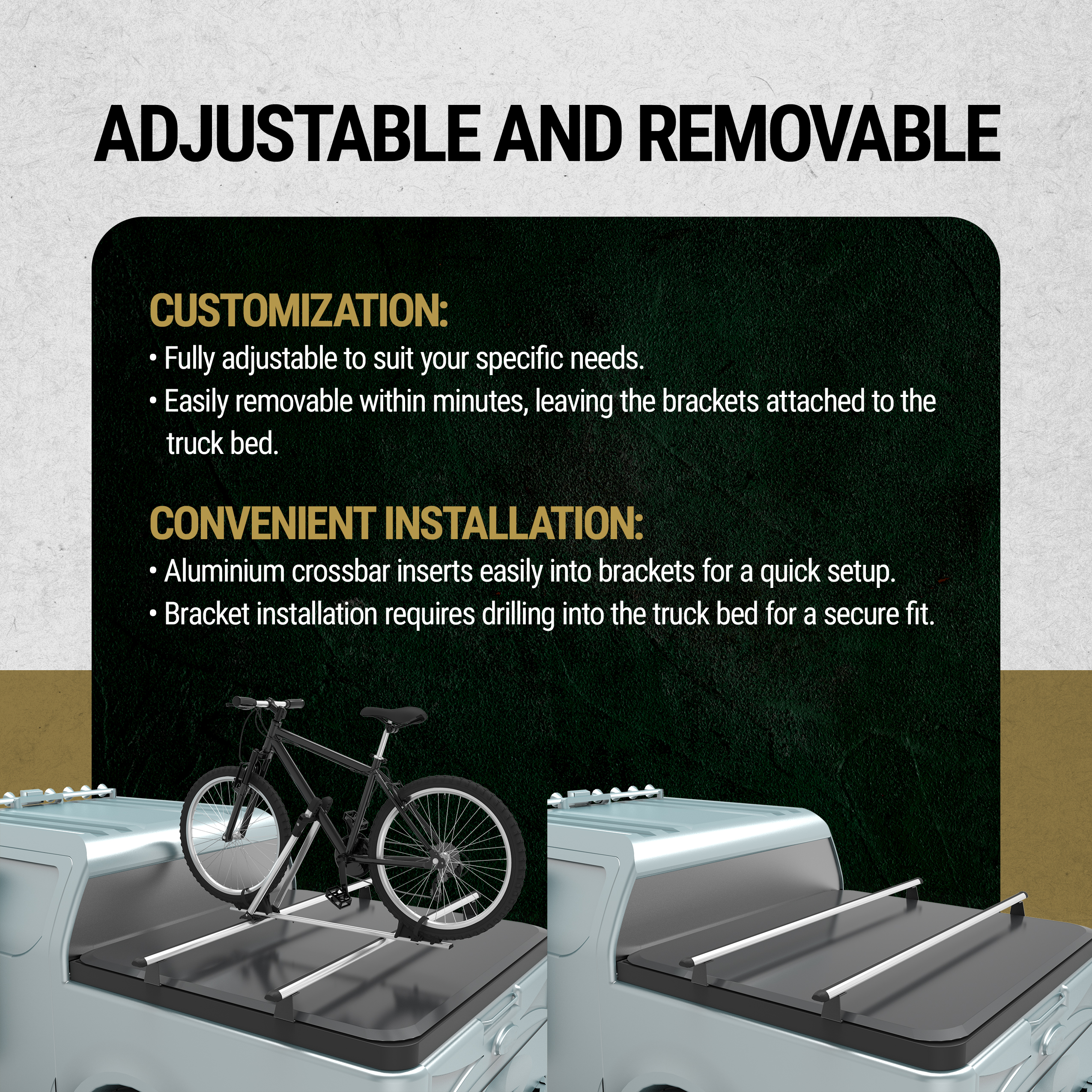 Fully adjustable to suit your needs, these truck cross bars offer effortless installation and can be quickly removed when not in use. The brackets remain secured to your truck bed for reinstallation when needed.